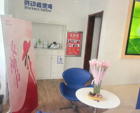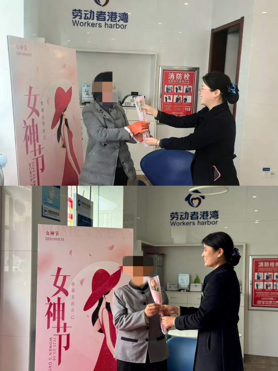网点提前布置温馨场景,劳动者港湾区域整洁明亮,鲜花整齐摆放、香气怡人。工作人员以饱满的热情迎接每一位客户,主动为女性劳动者、女性客户送上鲜花,轻声道一句:“女神节快乐,您辛苦了!”
