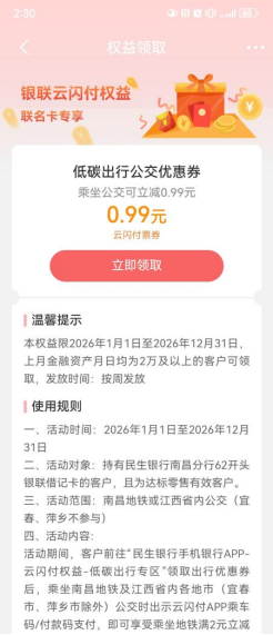 民生银行赣州分行紧扣“惠民生、促消费”两大主线,持续拓展社保卡的应用场景,让社保卡从传统的“保障卡”升级为融入生活的“百事卡”。依托社保卡的金融功能,积极参与各地消费促进活动,通过社保卡绑定支付优惠、消费满减等惠民举措,让持卡群众在日常购物、餐饮消费中享受实实在在的优惠。社保卡不仅成为群众手中的“贴心卡”,更成为拉动内需、激活消费的“活力卡”。同时,持续推动社保卡在政务服务、交通出行、文化旅游等多领域的应用融合。通过优化社保卡与手机银行、云闪付APP等的互联互通,群众足不出户即可完成社保查询、生活缴费等高频事项,真正实现“一卡通用、一网通办”。2026年推出“低碳出行”公共交通优惠活动,达标客户通过手机银行每月领取地铁1.99元优惠券或公交出行0.99元优惠券,通过云闪付APP出行专区乘车码支付,构建了惠民应用“新生态”。